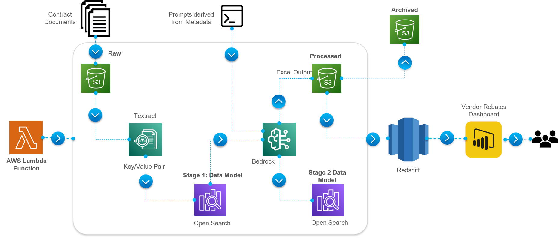 The solution architecture involved a multi-faceted approach using AWS services to transform the client's rebate contract management system.- AWS OCR Technology: Utilized for the initial extraction of key-value pairs, numerical values, and terms from the contracts.