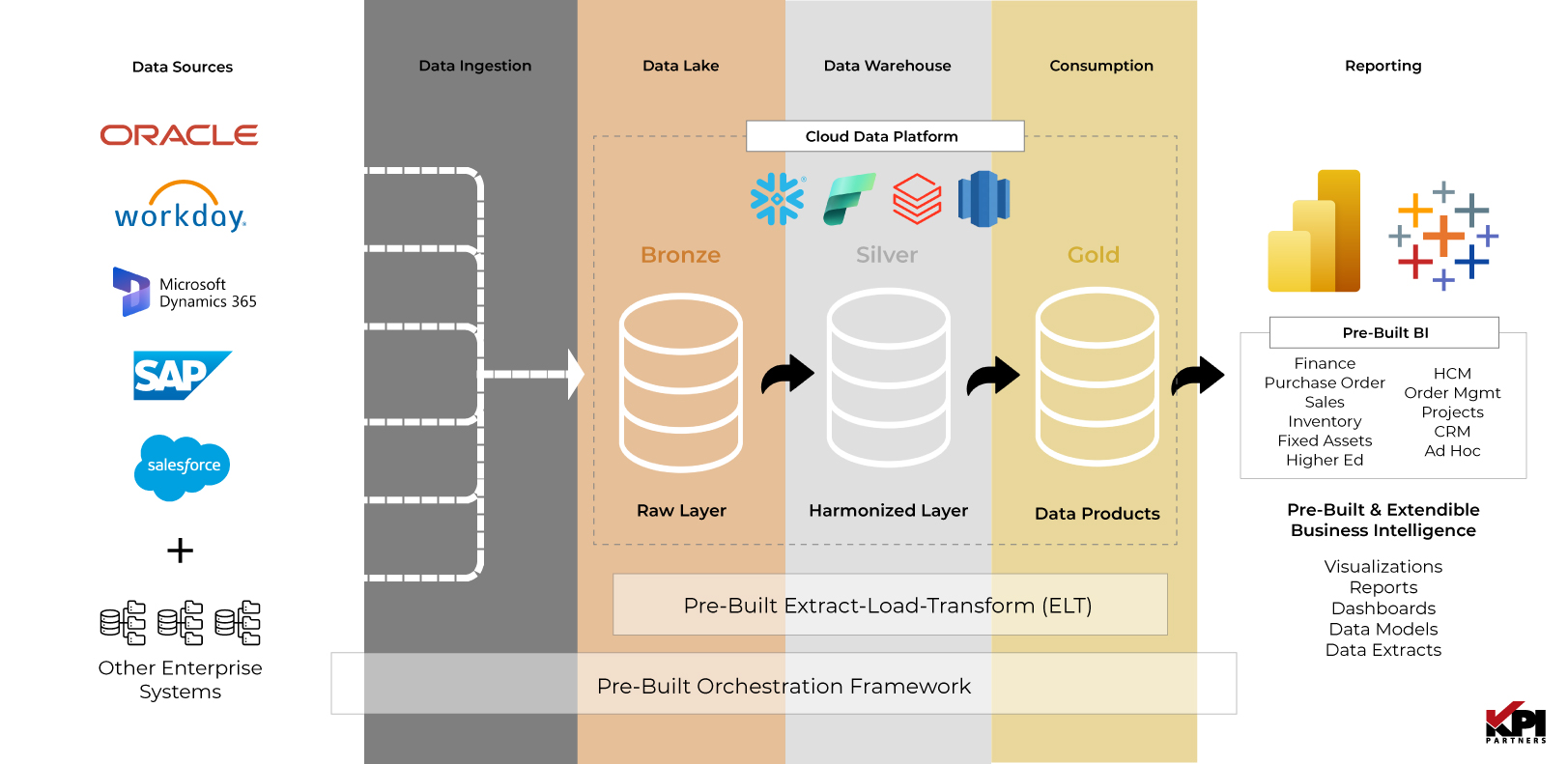 The Data Products Accelerator delivers pre-built analytics for Oracle Fusion, Workday, Microsoft Dynamics 365, SAP, Salesforce, and other enterprise systems.