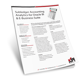 KPI Partners has developed a pre-packaged subledger accounting and reconciliation analytics solution for use on the Oracle Business Intelligence platform. Using the solution with Oracle E-Business Suite enables any organization to review their subledger accounting data and reconcile the general ledger, SLA, and any individual subledger.