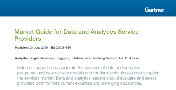 Source: Gartner Inc., Market Guide for Data and Analytics Service Providers (Document ID: G00367665), 24 June 2019; Analysts: Jorgen Heizenberg, Twiggy Lo, Ehtisham Zaidi, Shubhangi Vashisth, Alan D. Duncan). Gartner does not endorse any vendor, product, or service depicted in its research publications, and does not advise technology users to select only those vendors with the highest ratings or other designations. Gartner's research publications consist of the opinions of Gartner's research organization and should not be construed as statements of fact. Gartner disclaims all warranties, expressed or implied, with respect to this research, including any warranties of merchantability or fitness for a particular purpose.